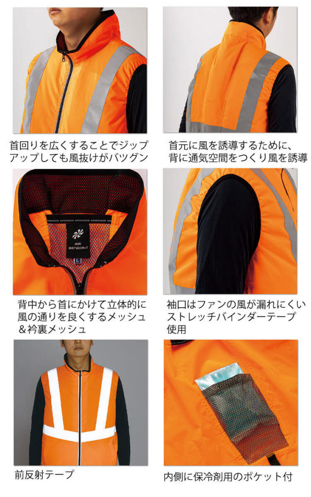 幅広の反射テープで高い視認性を確保し、現場で働く人を危険から守ります。暑い夏でも快適に作業が可能です。オレンジ色は高視認性安全服クラス1を取得しています。車両運転時にファンと背もたれがあたらないサイドファン仕様です。クロダルマ全商品全バリエーション取り揃え、最短翌日発送のミチオショップ。暑さ・熱中症対策と節電の両立を目指して、ファン付き作業着、バッテリー、ファン、インナー、付属品まで全て取り揃えております。