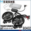 空調風神服トランスフォーマーセット90402です。モバイルバッテリーをトランスフォーマーケーブルを介すことで、空調風神服のバッテリーとして使用できるセットです。バッテリーのパワーは空調風神服のバッテリーよりは風量は弱いですが、お持ちのバッテリーの充電が切れた際の代替品としてご使用いただけます。十分バッテリーの代替として活躍できます。モバイルバッテリー、トランスフォーマーケーブル、ファンが揃っている、すぐに使えるスターターキットです。