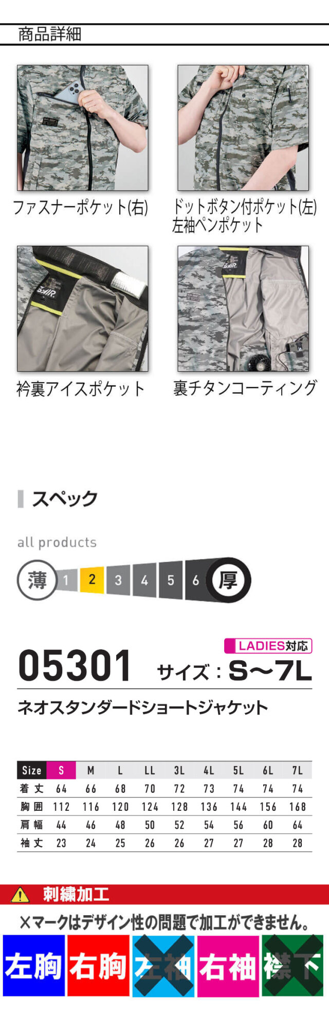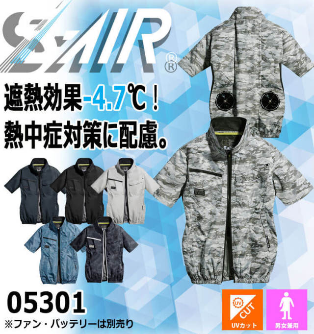 裏チタン加工でー4.7℃の遮熱効果を発揮する軽量素材で、署熱環境下でもさらっと着用できる半袖ブルゾンです。軽量・UVカット・遮熱をフルカバー。耐洗濯にも配慮した裏チタン加工を採用し、軽量ながら遮熱・UVカット効果を発揮するS-AIRフィット素材です。