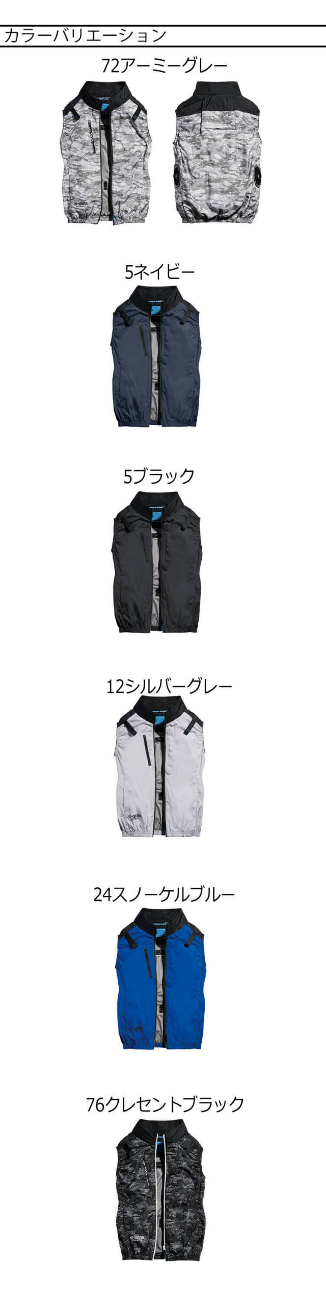 5ネイビー・12シルバーグレー・24スノーケルブルー・72アーミーグレー・76クレセントブラック・6ブラック