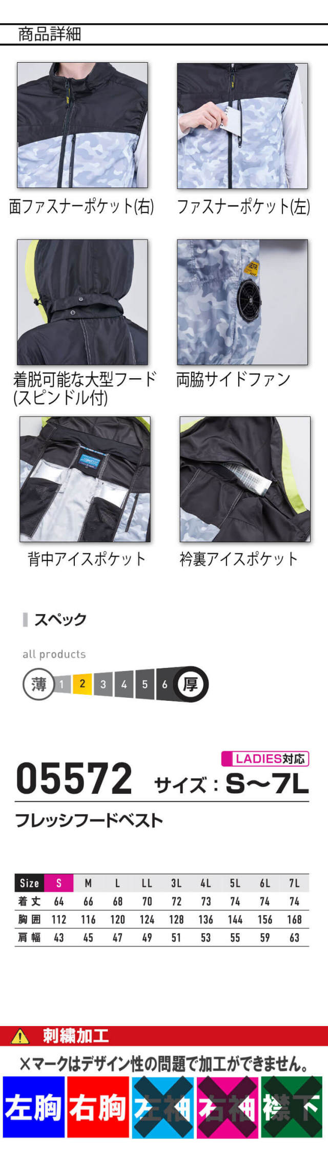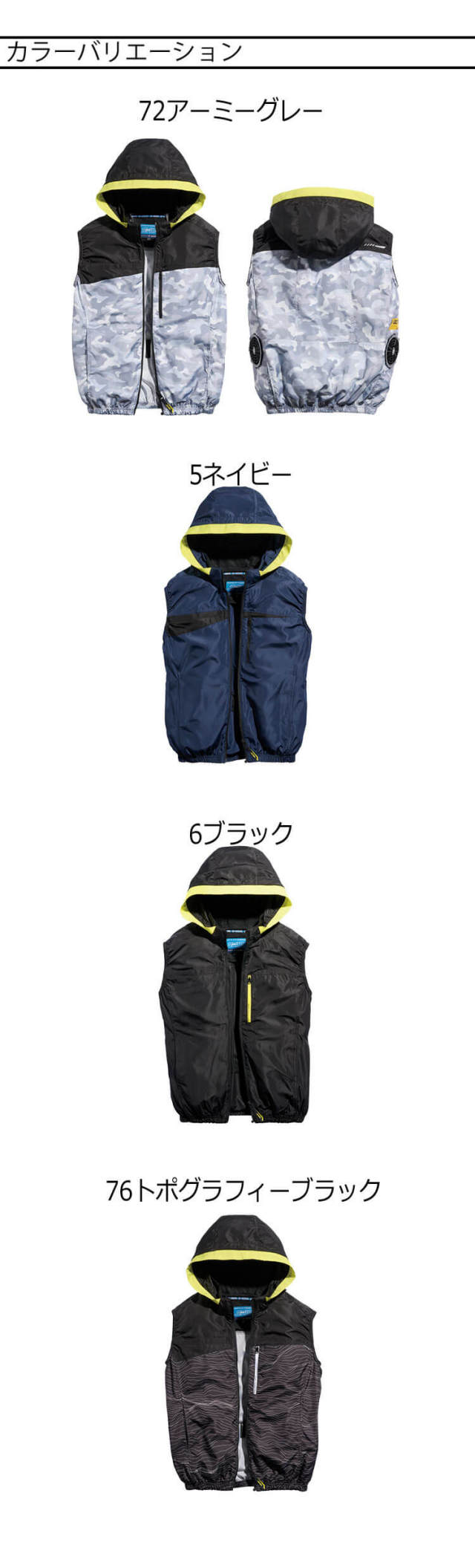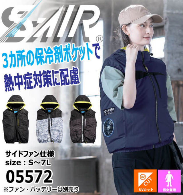 サイドファンと着脱可能な大型フード仕様のシンメンエスエアベストです。大胆な切替をデザインにしたスポーティスタイルです。肌ダメージを軽減する遮熱・UVカットで熱中症対策に配慮した実用的な3か所の保冷剤ポケット付きです。