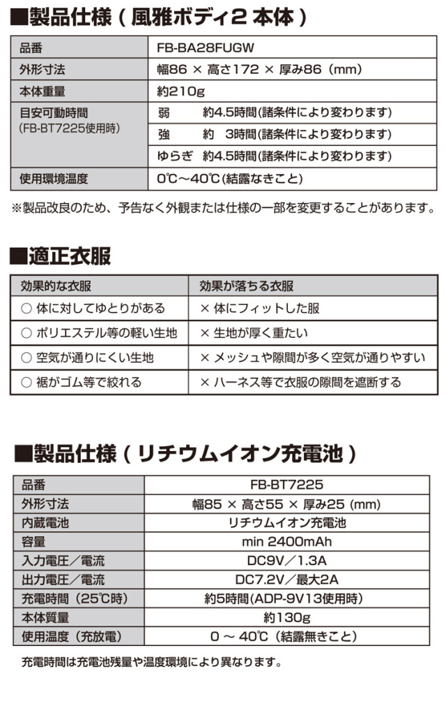 ☆清涼ファン風雅ボディ2ファンユニット FB-BA28FUGW☆清涼ファン風雅ボディ2ベルト FBP-BA28BL