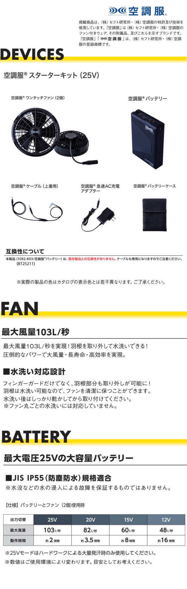 ・セット内容 :空調服、新型25Vバッテリー本体、ファン、ケーブル×1、急速AC充電アダプター(充電器)、バッテリーケース