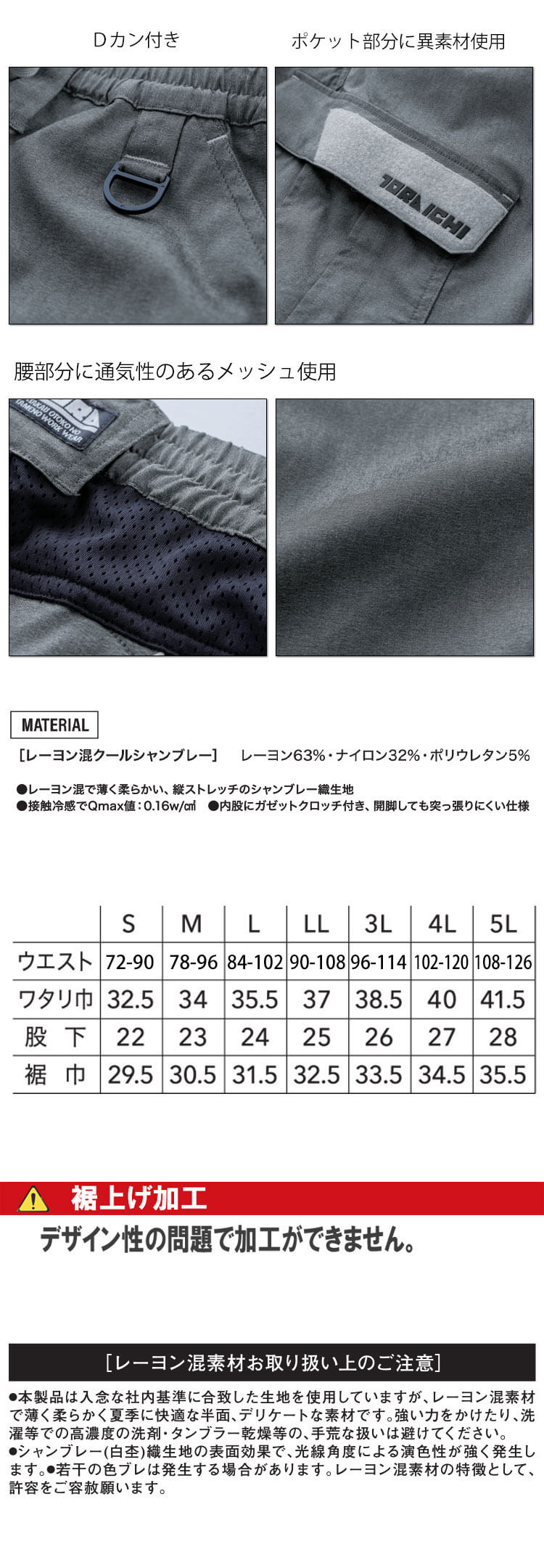 レーヨン混で薄く柔らかい、縦ストレッチのシャンブレー織生地の2132シリーズのカーゴハーフパンツです。 接触冷感、吸汗速乾で夏にぴったりなパンツです。内股にガゼットクロッチ付き、開脚しても突っ張りにくい仕様になっています。