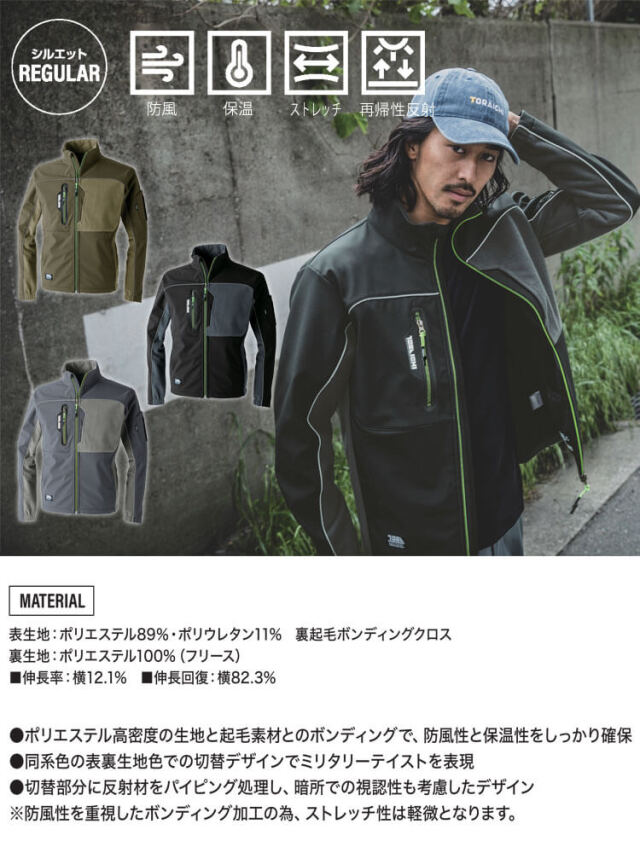 同系色の切替デザインでミリタリーテイストを表現した寅壱防寒ブルゾンです。反射材のパイピングにより暗所での視認性も考慮したデザインの防寒ブルゾンです。ポリエステル高密度の生地と起毛素材とのボンディングで、防風性と保温性をしっかり確保しています。防風性を重視したボンディング加工の為、ストレッチ性は軽微となります。