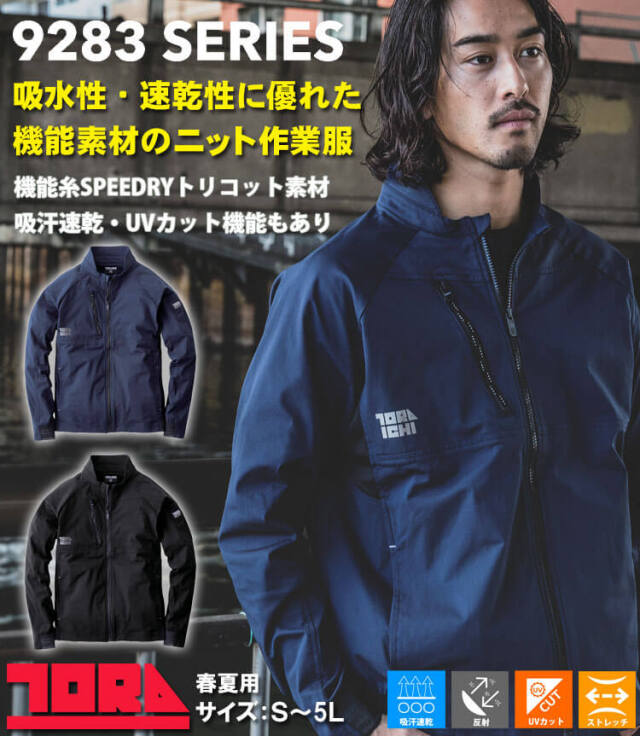 抜群の速乾性に優れた素材のニット作業服9283シリーズです。機能糸SPEEDRYトリコットは身体の動きに対する追従性に加えて吸水性や速乾性といった副次的な機能も魅力です。
