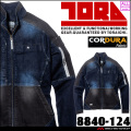 強度・伸縮性・デザイン性ともに優れた注目のデニム8840シリーズです。伸縮性の高いストレッチデニム【ラバーフレックス(R)】を取材に採用しました。さらに摩擦の発生が多い部分には黒のコーデュラ(R)を配し強度アップと切替デザインを生み出しました。ポケットファスナーの左右務歯の色替え、立体ロゴなどさりげないポイントもあります。折襟デザイン仕様です。コン×クロのバイカラー仕様です。