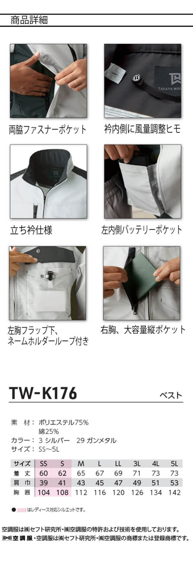 | 製品名: | 空調服 タカヤ商事 ベスト(ファンなし) TW-K176 日本製 帯電防止 |