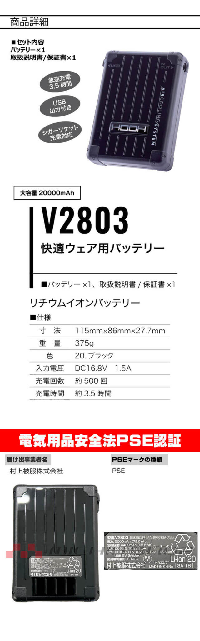 HOOHの快適ウェアのV28シリーズのリチウムイオンバッテリーの単体の販売ページです。粉塵が内部に侵入することを防止する防塵仕様と水の飛沫の影響を受けにくい防水仕様です。付属の充電器は充電時間約3.5時間の急速充電が可能です。USB出力やシガーソケットでの充電にも対応したハイスペックバッテリーです。村上被服の商品全バリエーション取り揃え、最短翌日発送のミチオショップ。暑さ・熱中症対策と節電の両立を目指して、HOOH、バッテリー、ファン、インナー、付属品まで全て取り揃えております。