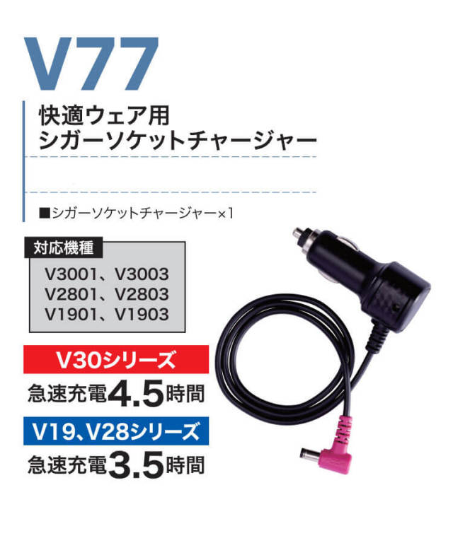 V19シリーズ対応の快適ウェア用シガーソケットチャージャーです。車のシガーソケットから快適ウェア用バッテリーを充電するシガーソケットチャージャーが登場しました。急速充電3.5時間対応型です。入力電圧12V・24V自動に切換えができます。村上被服の商品全バリエーション取り揃え、最短翌日発送のミチオショップ。暑さ・熱中症対策と節電の両立を目指して、ファン付き作業着、バッテリー、ファン、インナー、付属品まで全て取り揃えております。