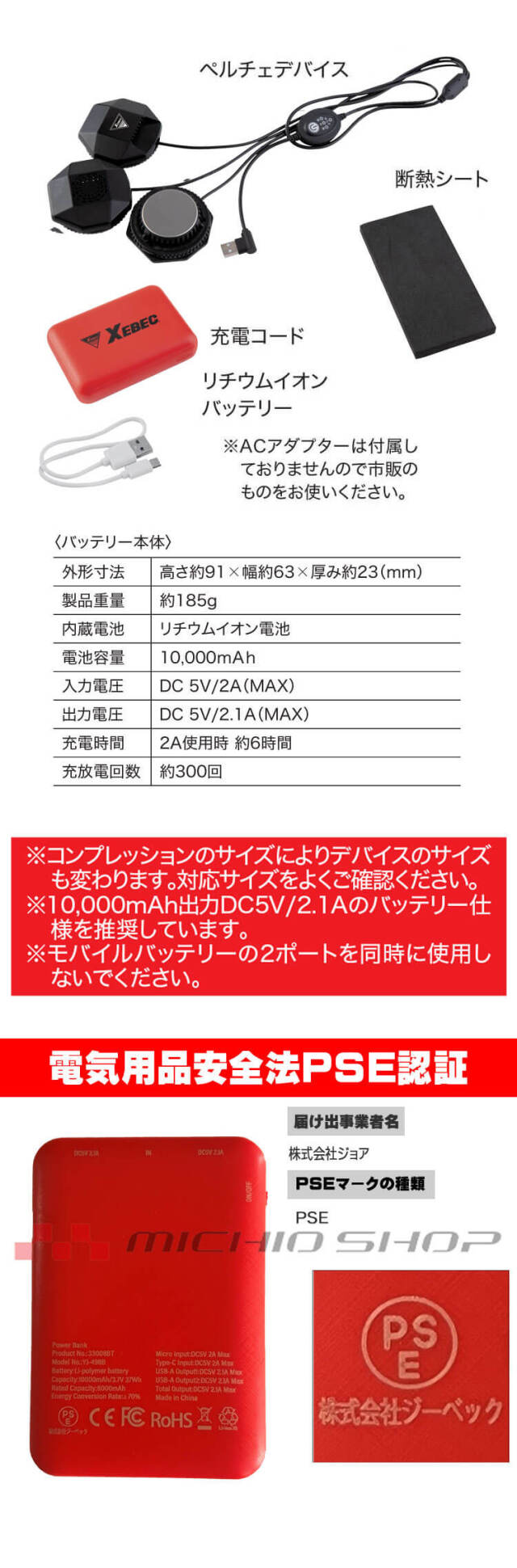 ジーベック XEBEC 33005 ペルチェコンプレッションインナーバッテリー付きのフルセットのページです。人気作業服メーカーのジーベック XEBECのペルチェコンプレッションインナーとモバイルバッテリーを販売しております。首裏、両脇の3ヶ所にペルチェデバイスを装着し即冷却が可能です。専用のミニバッテリーで簡単操作!強・中・弱・ゆらぎの4段階で温度切替が可能です。コンプレッションインナーの素材はヒンヤリしたナイロン素材です。レジャー、アウトドアなどシーンを選ばずご着用いただけます。土木・建設・建築・工務店、製造、工場・電気工事・設備、農業・農園・造園・運送・倉庫・軽作業、ビルメンテナンス・清掃・食品工場・飲食店、ウォーキング・ガーデニング・アウトドア・レジャー・イベント・スポーツ観戦・フェス・学生・学校などあらゆるシーンで活躍できます。ジーベックの商品全バリエーション取り揃え、最短翌日発送のミチオショップ。暑さ・熱中症対策と節電の両立を目指して、ペルチェデバイス、バッテリー、コンプレッションインナー、付属品まで全て取り揃えております。