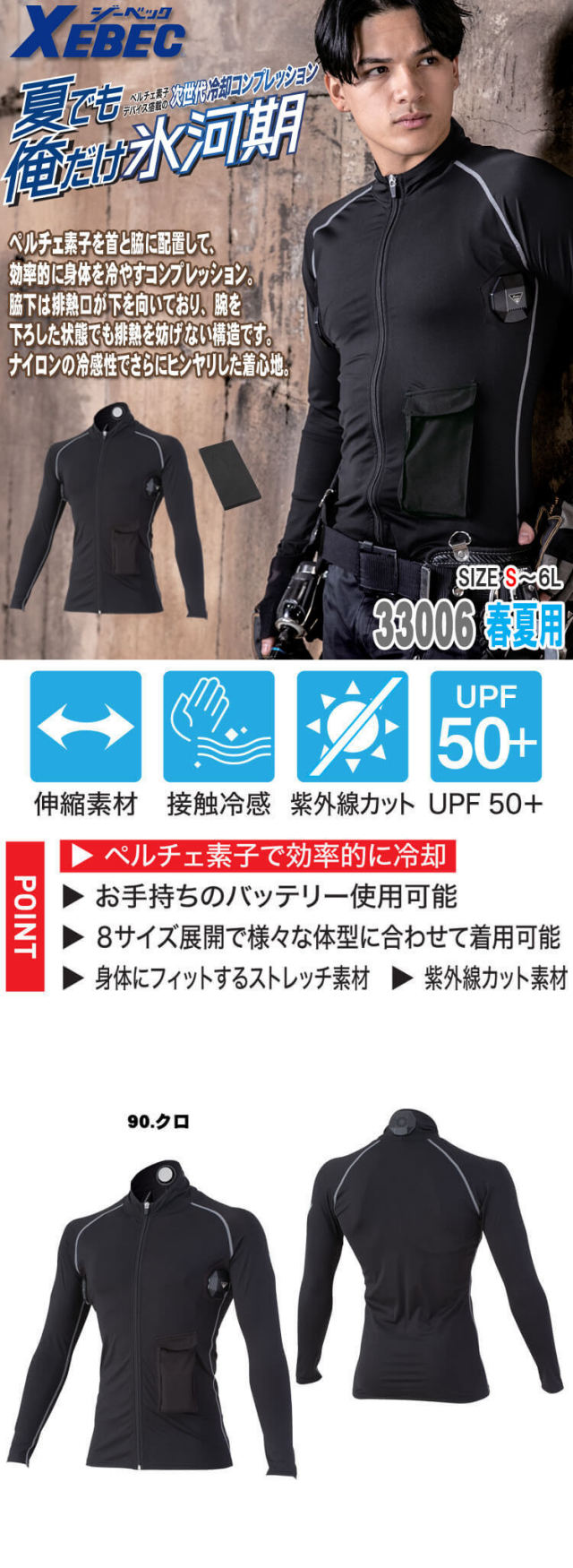 ジーベック XEBEC 33006 ペルチェコンプレッションインナーの単品のページです。洗い替えにお勧めです。人気作業服メーカーのジーベック XEBECのペルチェコンプレッションインナーを販売しております。首裏、両脇の3ヶ所にペルチェデバイスを装着し即冷却が可能です。専用のミニバッテリーで簡単操作!強・中・弱・ゆらぎの4段階で温度切替が可能です。コンプレッションインナーの素材はヒンヤリしたナイロン素材です。レジャー、アウトドアなどシーンを選ばずご着用いただけます。土木・建設・建築・工務店、製造、工場・電気工事・設備、農業・農園・造園・運送・倉庫・軽作業、ビルメンテナンス・清掃・食品工場・飲食店、ウォーキング・ガーデニング・アウトドア・レジャー・イベント・スポーツ観戦・フェス・学生・学校などあらゆるシーンで活躍できます。ジーベックの商品全バリエーション取り揃え、最短翌日発送のミチオショップ。暑さ・熱中症対策と節電の両立を目指して、ペルチェデバイス、バッテリー、コンプレッションインナー、付属品まで全て取り揃えております。
