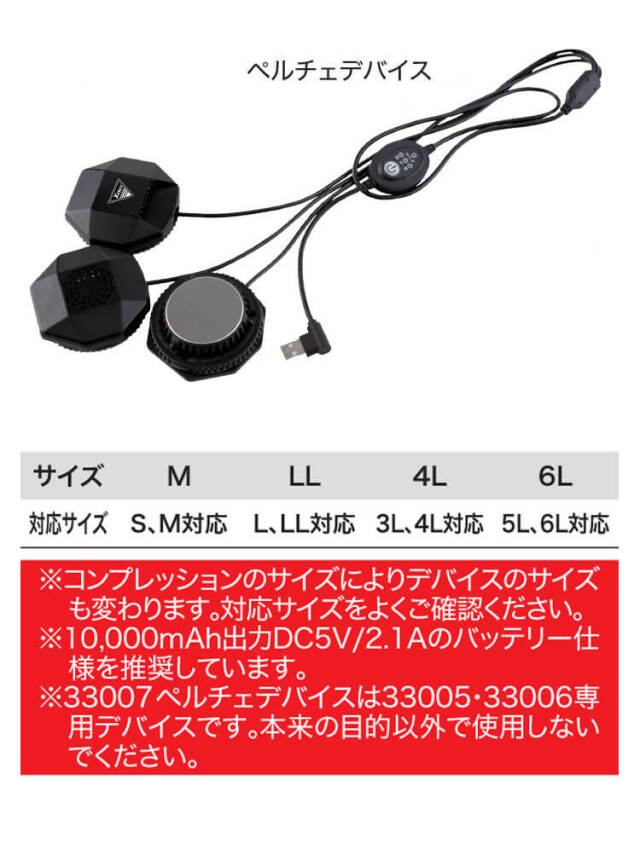 ジーベック XEBEC 33007 ペルチェ冷却デバイスのページです。人気作業服メーカーのジーベック XEBECのペルチェデバイスを販売しております。首裏、両脇の3ヶ所にペルチェデバイスを装着し即冷却が可能です。専用のミニバッテリーで簡単操作!強・中・弱・ゆらぎの4段階で温度切替が可能です。コンプレッションインナーの素材はヒンヤリしたナイロン素材です。レジャー、アウトドアなどシーンを選ばずご着用いただけます。土木・建設・建築・工務店、製造、工場・電気工事・設備、農業・農園・造園・運送・倉庫・軽作業、ビルメンテナンス・清掃・食品工場・飲食店、ウォーキング・ガーデニング・アウトドア・レジャー・イベント・スポーツ観戦・フェス・学生・学校などあらゆるシーンで活躍できます。ジーベックの商品全バリエーション取り揃え、最短翌日発送のミチオショップ。暑さ・熱中症対策と節電の両立を目指して、ペルチェデバイス、バッテリー、コンプレッションインナー、付属品まで全て取り揃えております。