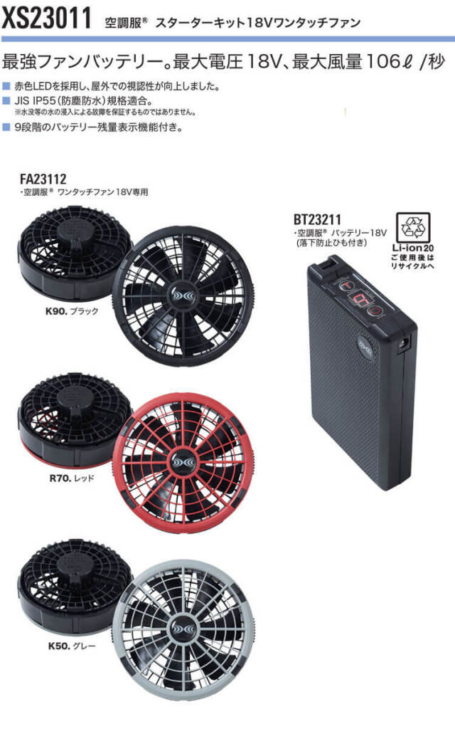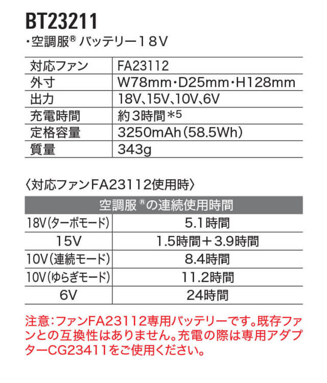 注意:18V専用ファンFA23112をご使用になる場合は必ず対応バッテリーBT23211、対応ケーブルCB23311、CB23312をご使用ください。