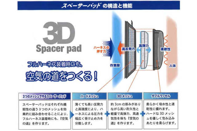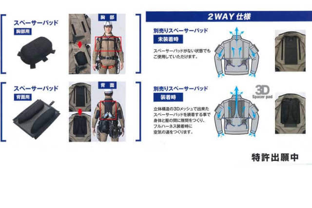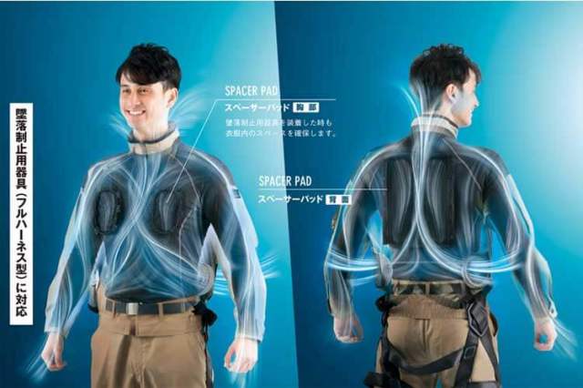 墜落制止用器具本来の安全機能が阻害されることの無い装着方法の空調服をめざいて「SPACER PAD System」(スペーサーパッド構造)を開発。通常の空調服としてはもちろん、通気性と抜群のクッション性をあわせ持つ(3Dメッシュ)を使用した「SPACER PAD」をウェア内側の胸部と背面の3か所に配置することにより空気の通り道を確保し快適さをそのままにウェアの外側に墜落制止用器具を装着できる新空調服です。