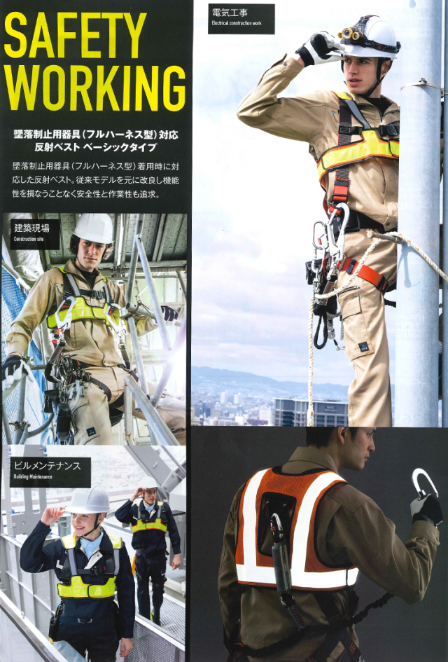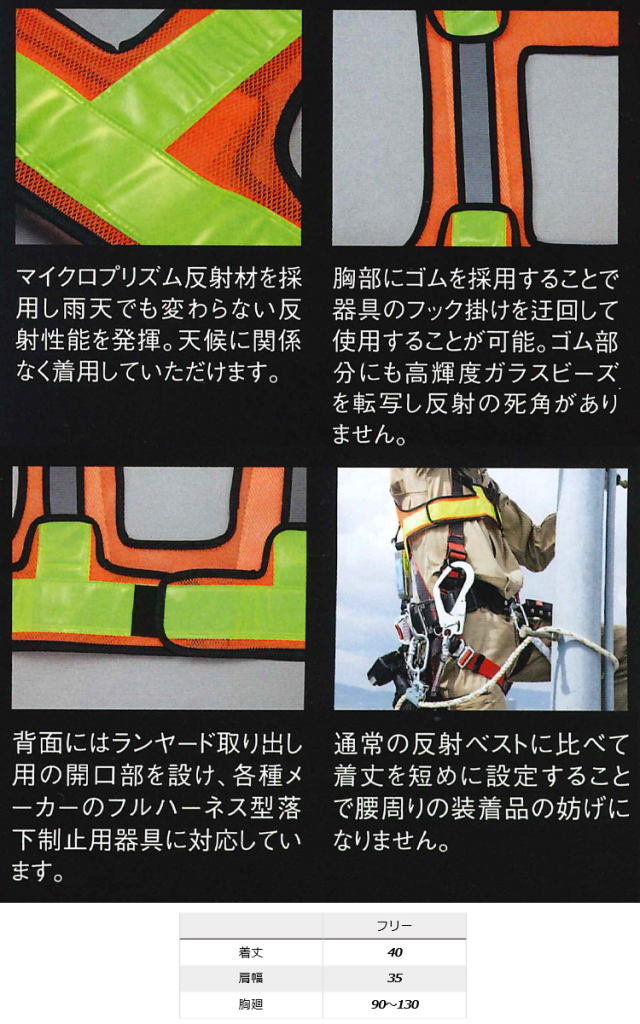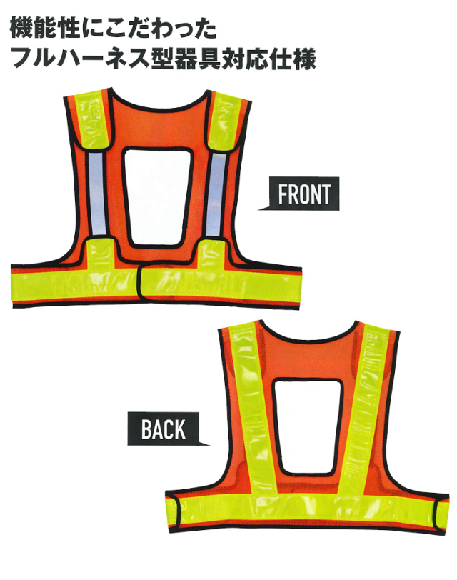 堕落制止用器具(フルハーネス型)着用時に対応した反射ベストです。機能性を損なうことなく安全性と作業性を追求しています。マイクロプリズム反射材を採用し雨天でも変わらない反射性能を発揮します。天候に関係なく着用していただけます。胸部にゴムを採用することで器具のフック掛けを迂回して使用することが可能です。ゴム部分にも高輝度ガラスビーズを転写し反射の死角がありません。背面にはランヤード取り出しようの開口部を設け各種メーカーのフルハーネス型落下防止用器具に対応しています。通常の反射ベストに比べて着丈を短めに設定することで腰周りの装着品の妨げになりません。