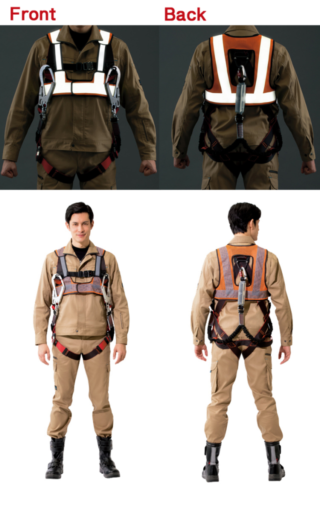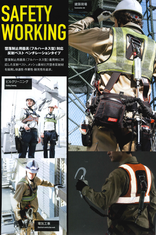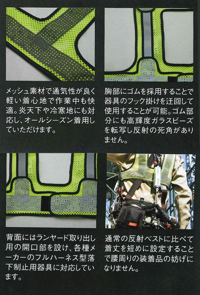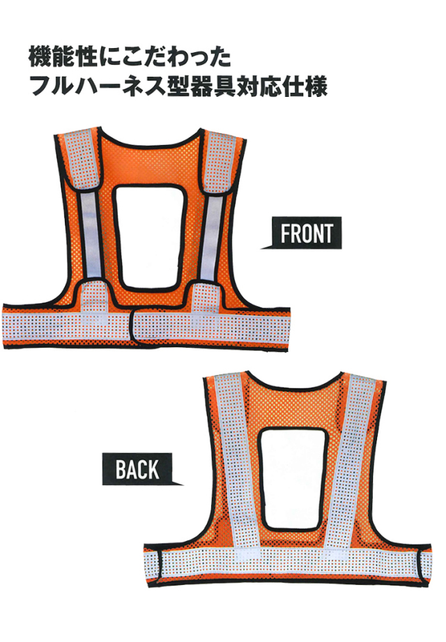 堕落制止用器具(フルハーネス型)着用時に対応した反射ベストです。機能性を損なうことなく安全性と作業性を追求しています。メッシュ素材で通気性が良く軽い着心地で作業中も快適です。炎天下や冷寒地にも対応しオールシーズン着用していただけます。胸部にゴムを採用することで器具のフック掛けを迂回して使用することが可能です。ゴム部分にも高輝度ガラスビーズを転写し反射の死角がありません。背面にはランヤード取り出しようの開口部を設け各種メーカーのフルハーネス型落下防止用器具に対応しています。通常の反射ベストに比べて着丈を短めに設定することで腰周りの装着品の妨げになりません。