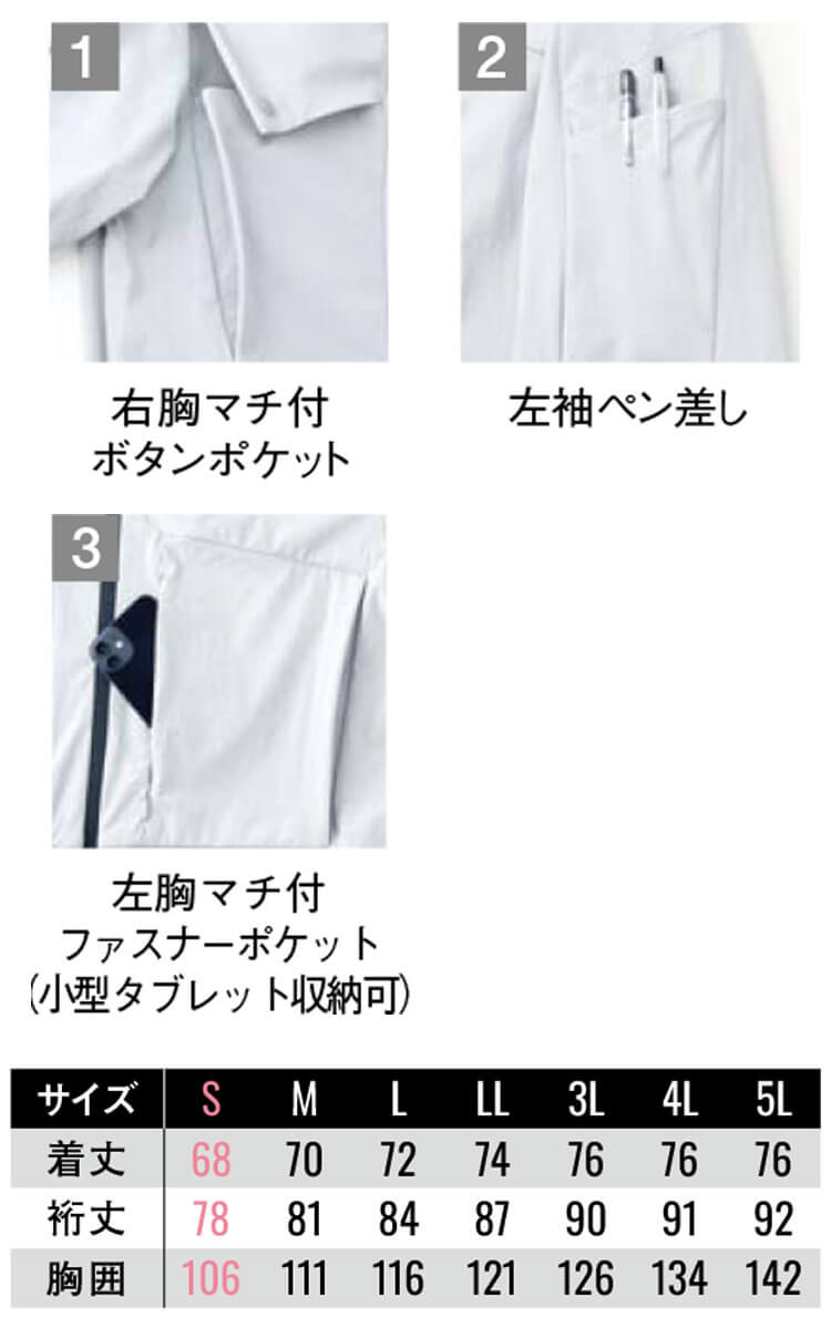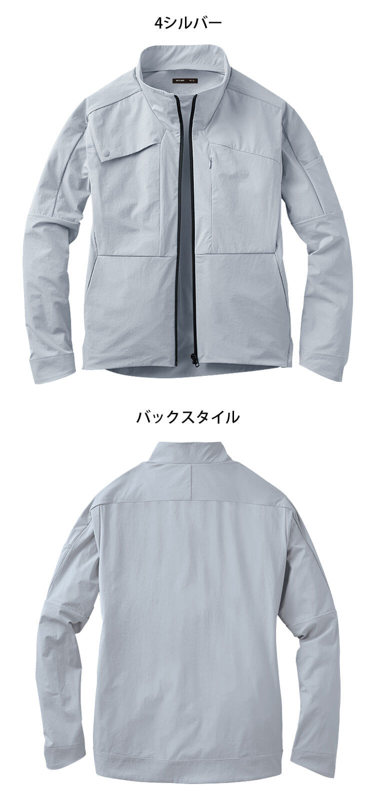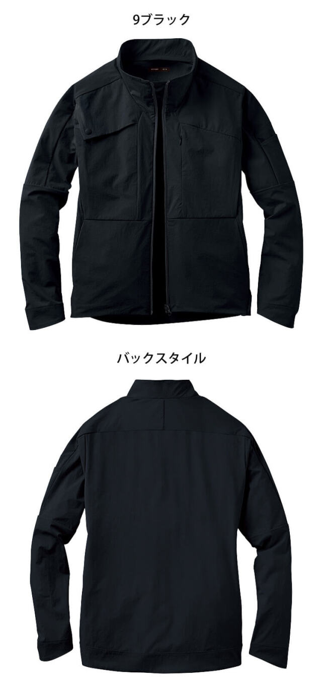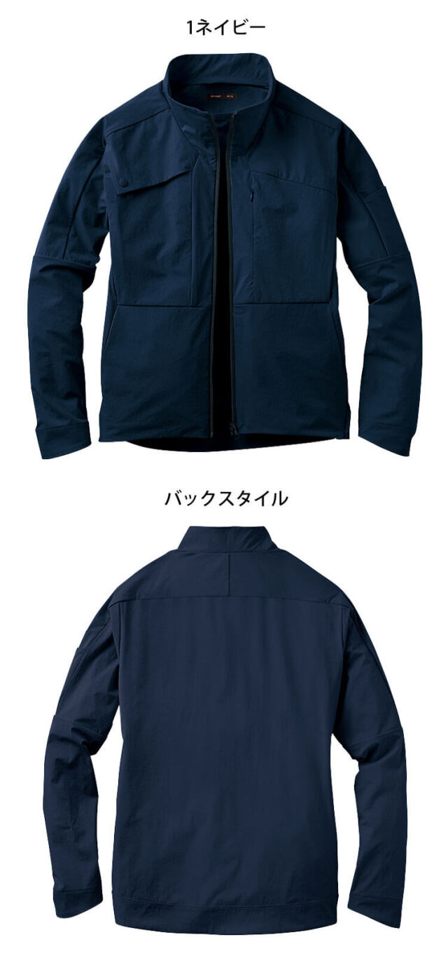 ニット素材の自由な伸縮性と織物の耐久性を両立した高価素材を使用しています。高形態安定性で折りシワがつきにくく、ワーカーの動きを科学した3Dカッティングのスリムシルエットでストレスから解放される着心地です。