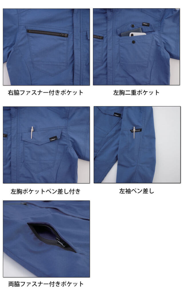 ストレッチ性と丈夫さを兼ね備えた新開発、TC制電ストレッチ素材を使用したフルハーネス対応ポケットワークウェア。