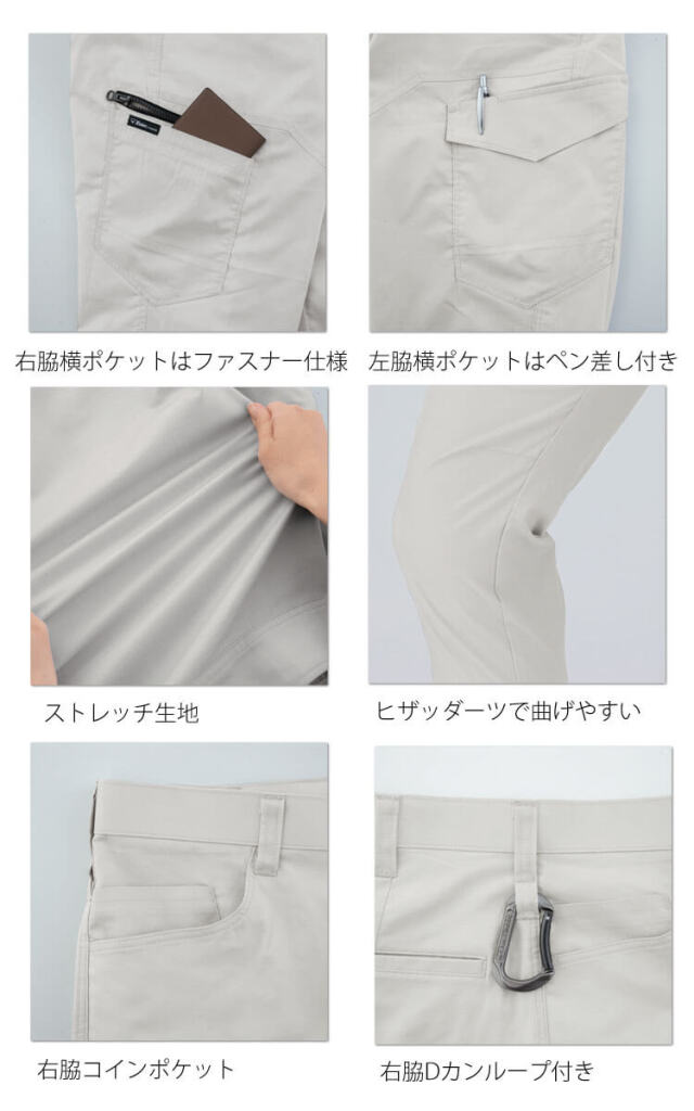 帯電防止作業服JIS T8118にも適合し様々な職種で安心して着用できるジーベック作業服ラットズボンです。環境にやさしい植物由来でストレッチ性に優れたエコロジー素材「Sorona」を使用し、20%超える高い伸長率で動きやすく、フラットに仕上げることでヒンヤリとした着心地を実現しました。