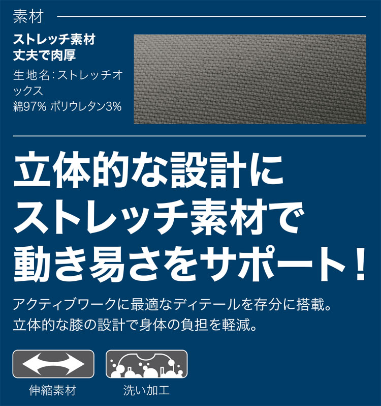立体的な設計にストレッチ素材で動きやすさをサポート。アクティブワークに最適なディテールを存分に搭載。ワンランク上の現場服。