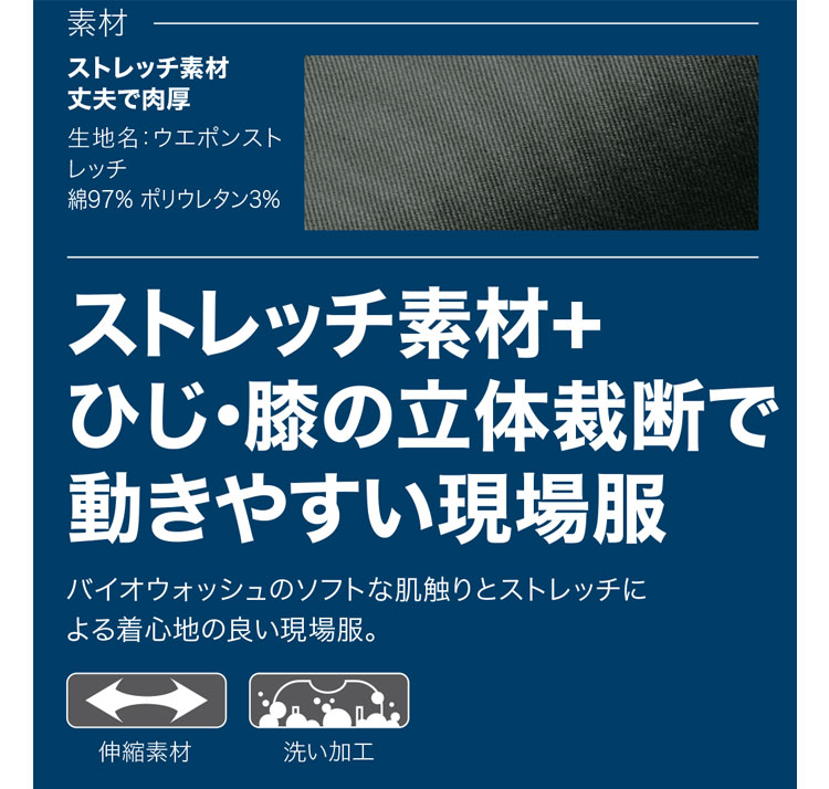 ストレッチ+立体裁断で動きやすい現場服。バイオウオッシュのソフトな肌触りと着心地。シルエットも細身になり、よりスタイリッシュに。
