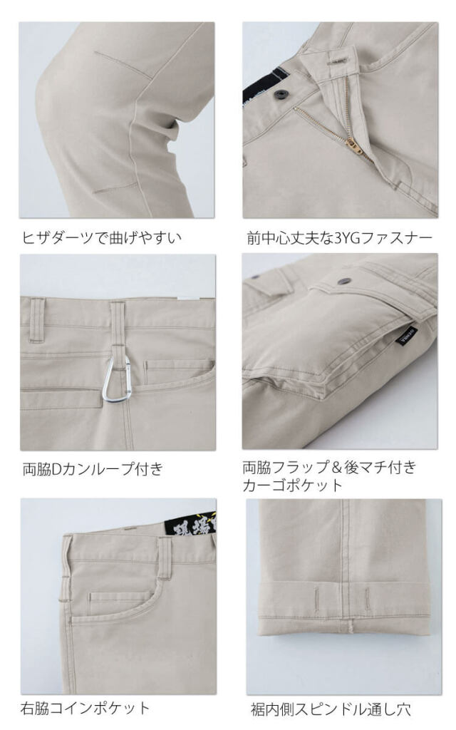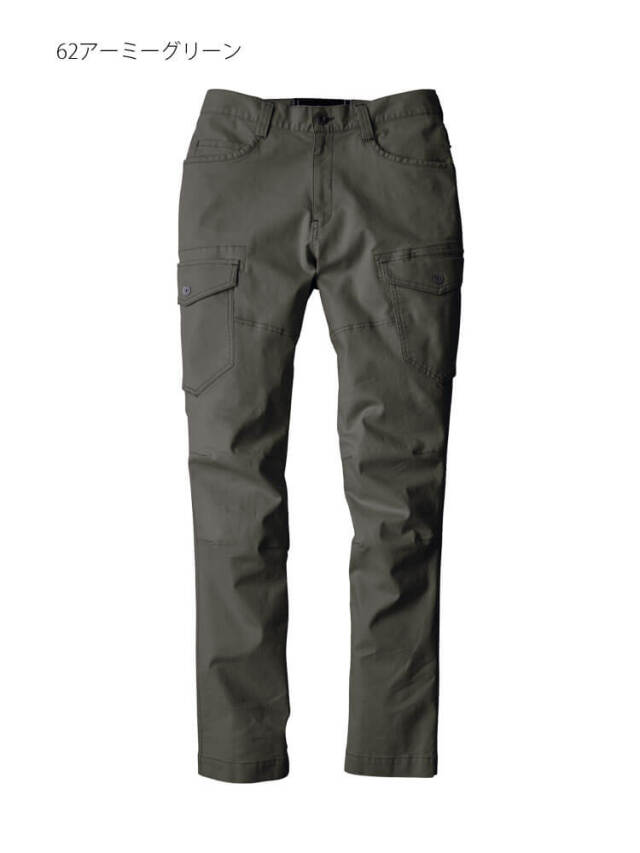 現場服のカーゴパンツです。洗い加工を施した生地はユーズド感がありながらも、ドビー織の凹凸感でハードな印象を与えます。ポリウレタン糸の入ったのびのびストレッチとやわらかい風合いで着用時の窮屈感を軽減します。超伸びストレッチ素材を使用した作業服です。