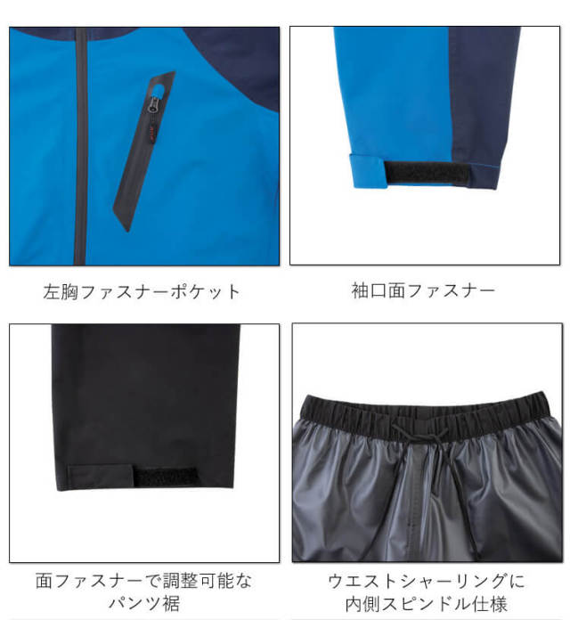 雨の日でも風の日もいつでも着られる全天候型レインウェア。透湿性、防水性のあるストレッチ素材を使用した全天候型レインウェア。単色だシンプルなデザインは様々なシーンで着用できます。水の侵入を防ぐ目貼り仕様やポケットの水切り仕様、屈伸時のずり上がりを防止するシリコンパイピングなどレインウェアとしての機能はバッチリ。防水ラミネートは防風性もありウィンドブレーカーとしても着用いただけます。透湿性にも優れ、蒸れにくい素材でいつでもどこでも快適に着用いただけます。