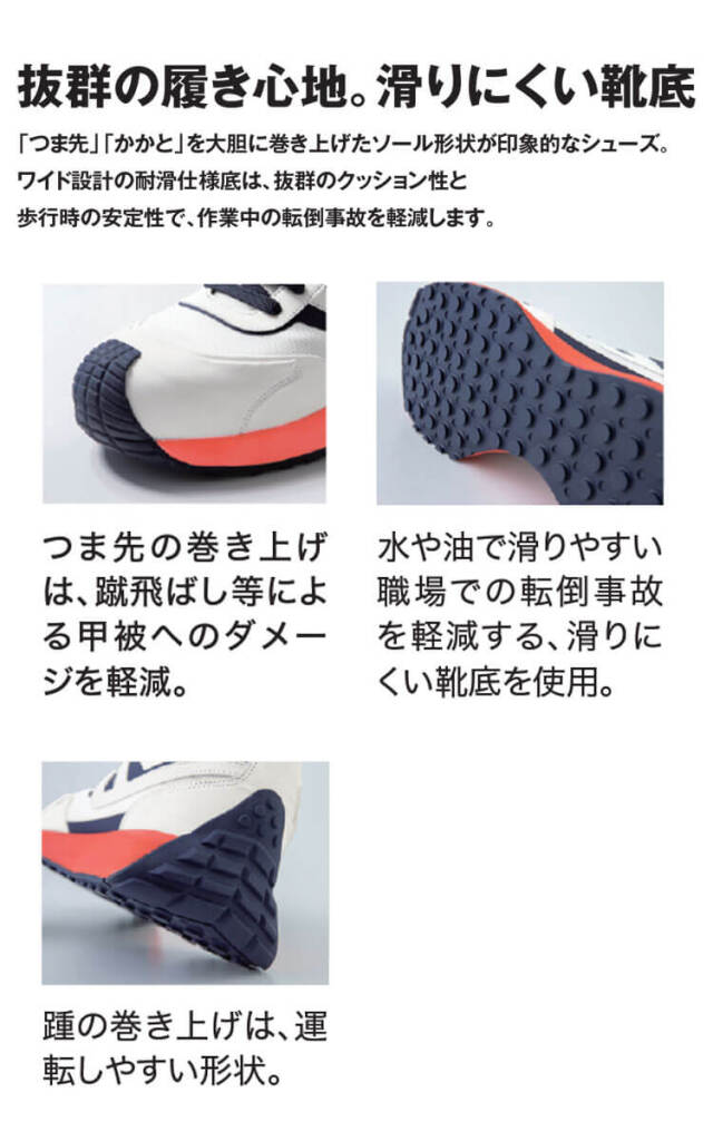耐滑・クッション性抜群のジーベック樹脂先芯の安全靴です。「つま先」「かかと」を大胆に巻き上げたソール形状が印象的な作業靴です。ワイド設計の耐滑仕様底は、抜群のクッション性と歩行時の安定性で、作業中の転倒事故を軽減します。