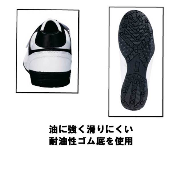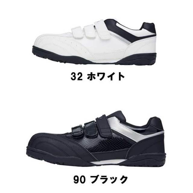 モノトーンを引き立てるエナメル合皮の輝き。光沢のあるエナメル合皮をモノトーンのクールなデザインでまとめたセフティシューズ。着脱が簡単にできる3本のマジックテープ仕様で、わずか640g(両足)という驚きの軽量化が図られています。