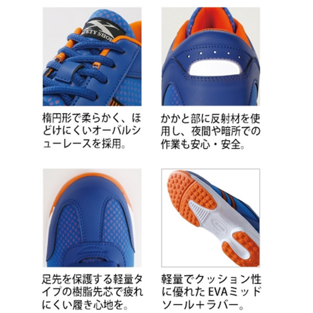 ジーベック史上最軽量。樹脂先芯にEVAミッドソール。アッパーにはメッシュを使用し、超軽量化を実現。物流業や運送業などのフットワークが重視される現場に最適です。