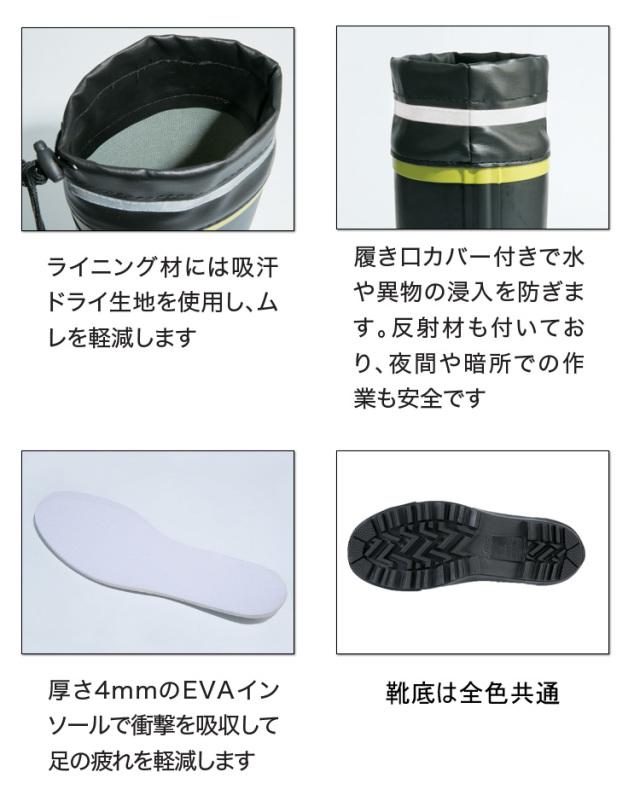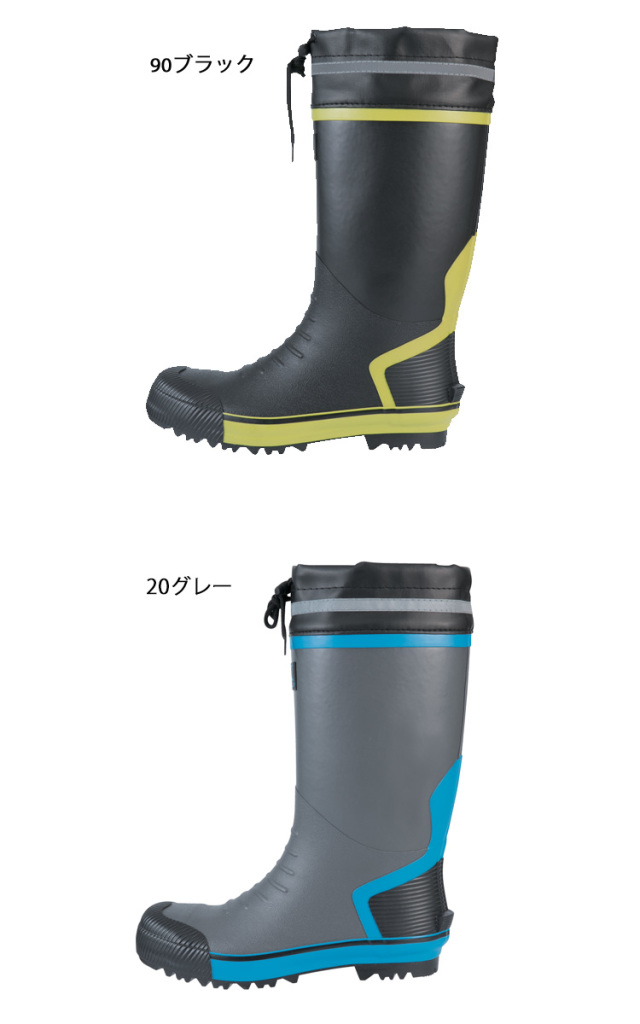 配色でのデザインを施した鋼製先芯入りのセフティ長靴。裏地には吸汗ドライ生地を採用し、靴内のムレを軽減し、快適に作業ができます。