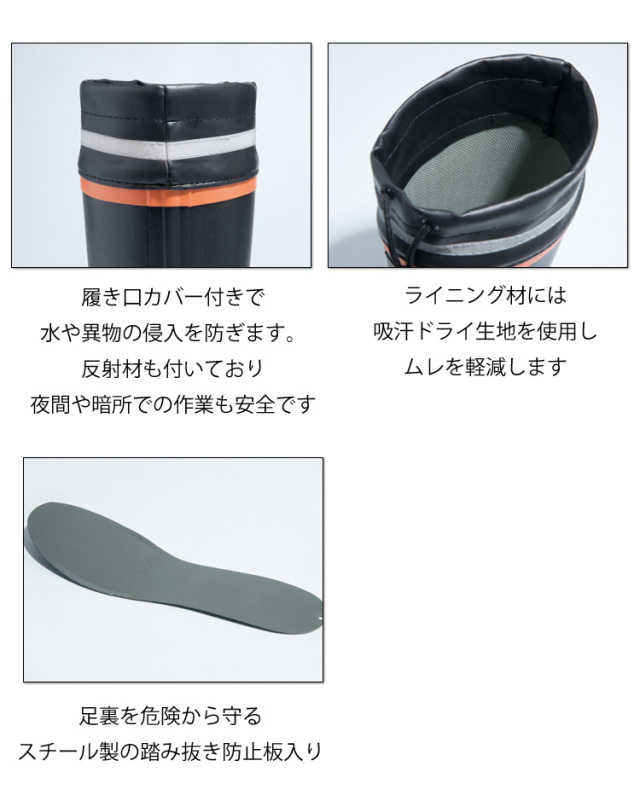 解体現場やゴミ処理場等、足元が危険な現場で活躍する踏み抜き防止長靴。災害用でも幅広く使用が可能です。