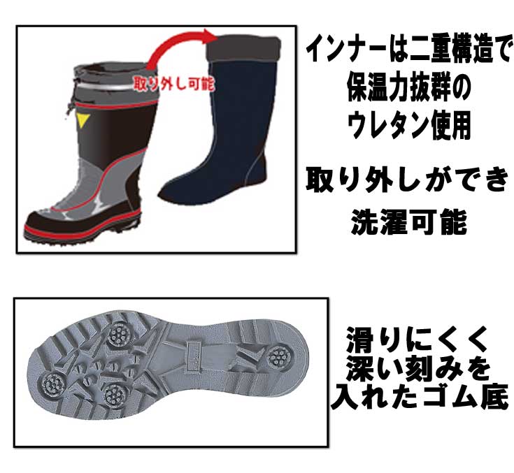 抜群の保温性を誇る先芯無しの防寒長靴。ウレタン素材を使用した二重構造インナー高い保温性で足元を守ります。ソールは深い切れ込みを入れたゴム底です。