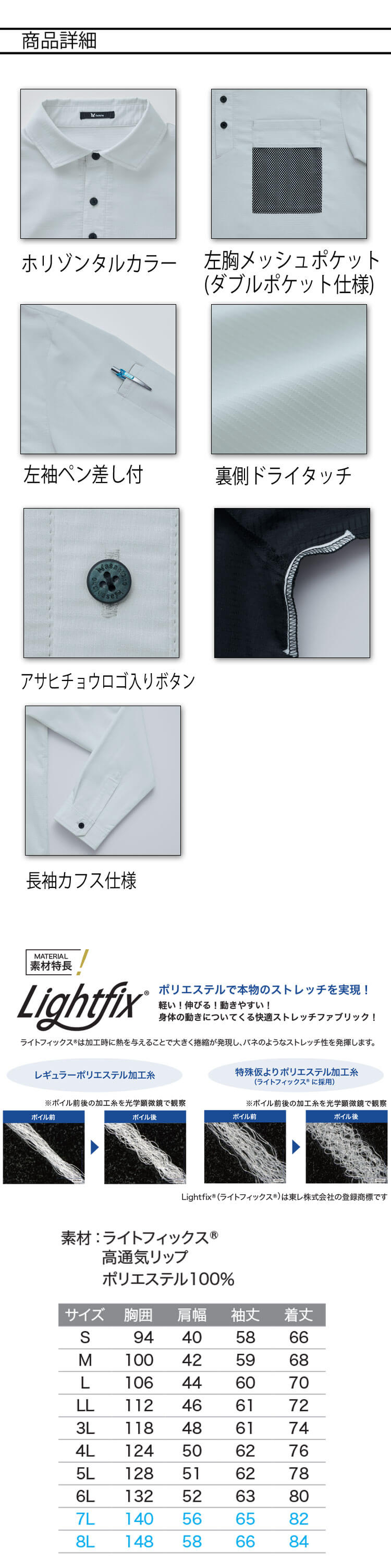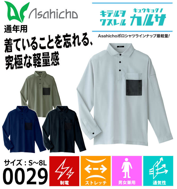 アサヒチョウの長袖ファブリックシャツです。アサヒチョウのポロシャツの中で最軽量です。ポロスタイルでもきちっと感もあってアクティブにも着て働ける一着二役の長袖ポロシャツです。通気度約70ccの高通気性で裏側ドライタッチになっているのでべとつきしにくいです。帯電防止規格適合で機能性も抜群です。軽い、伸びる、動きやすい、身体の動きについてくる快適ストレッチ生地のシャツです。