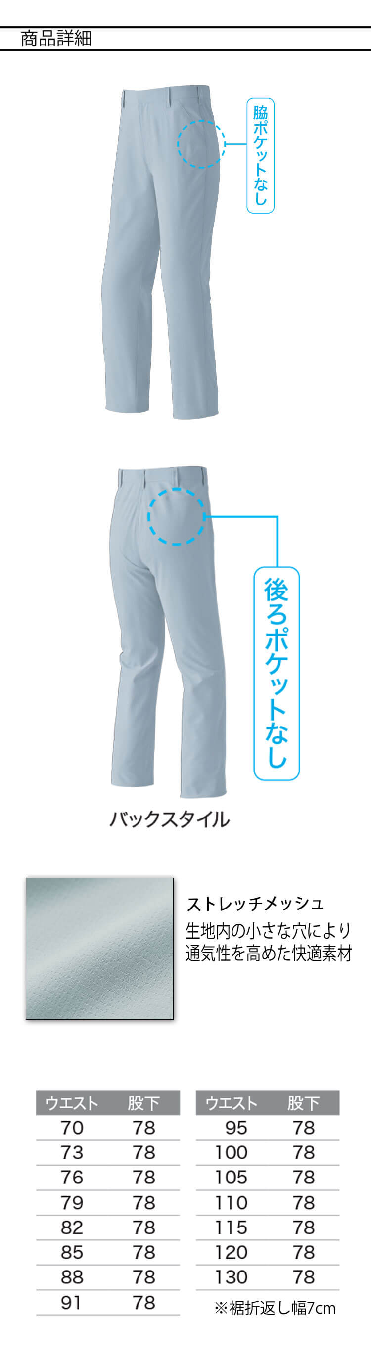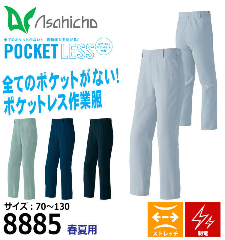 アサヒチョウのポケットレスパンツです。すべてのポケットがないため異物混入を防ぐ切り札にもなり、涼しさとストレッチ性を兼ね備えたポケットレス作業着の春夏シリーズです。ファスナーとボタン等の露出を抑えて商品への傷つけを防止する傷つけ防止設計になっています。