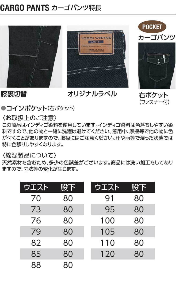作業着 通年 Asahicho YOROI WORKS LIGHT デニム カーゴパンツ K131 軽量 ストレッチ