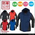 次世代テイストのNEWワークウェア、「A-3170」シリーズの防寒。裏地に熱反射プリント、袖口裏フリース、衿裏ブロックフリース等、温かい機能満載。ヘルメットフード、W前立て、表面突起付属無し、反射等で幅広い業種に対応。