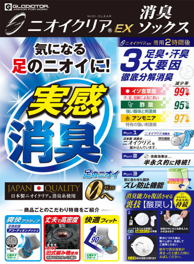 気になる足のニオイに、実感消臭。ニオイクリアEX消臭ソックス。汗、足、加齢によるニオイ・強い酸味と刺激臭・特有の強い刺激臭など3大要因を着用2時間後には徹底分解消臭。消臭効果は半永久的に持続します。日本製消臭糸ニオイクリアを編み込んでいます。