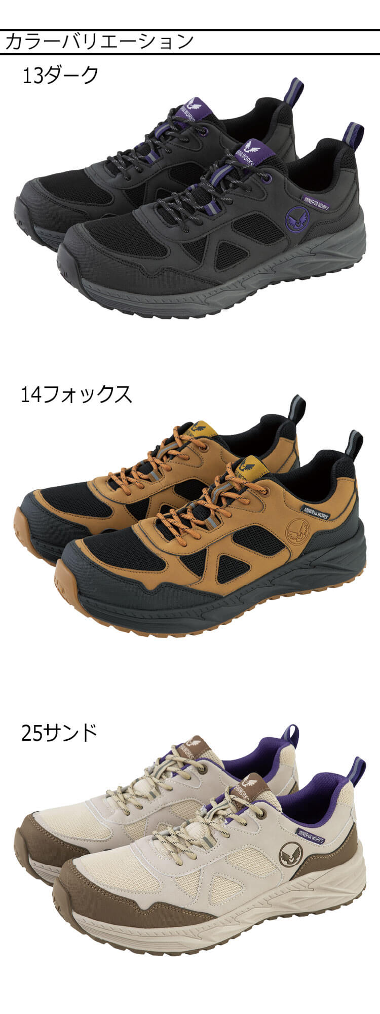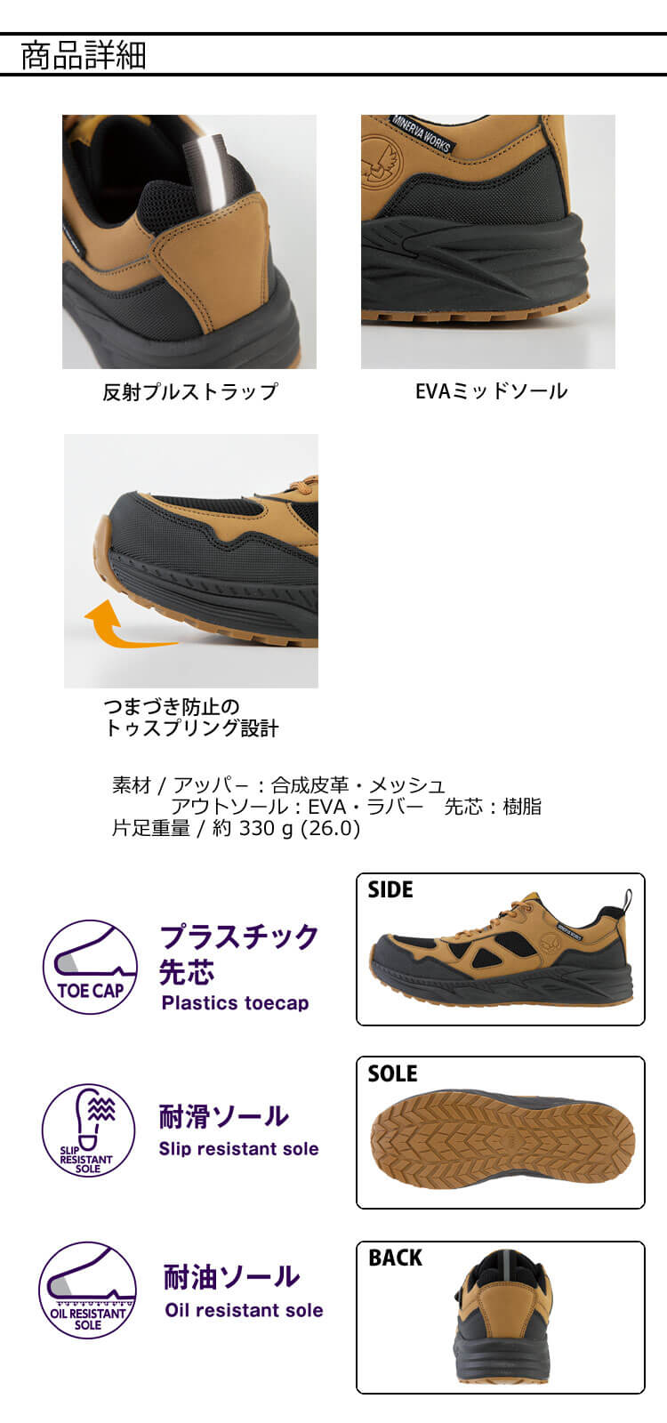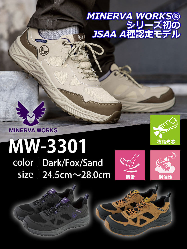 「MINERVA WORKS(ミネルヴァワークス)」シリーズ初のJSAA A種認定モデルのプロテクティブスニーカーです。紐タイプでフィット感を調整可能です。耐油性・耐滑性に優れたソールにトゥスプリング設計でつまづきにくい仕様です。タフにはけてタクティカルに魅せる機能系ワークシューズです。