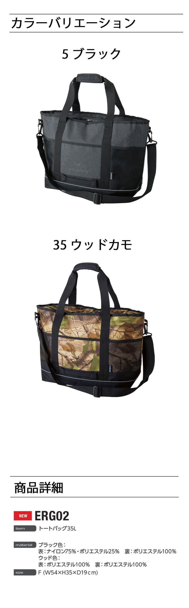 荷物をたっぷり収納できる35Lサイズ。スポーツ用品、キャンプギア、旅行の荷物など、必要なものを持ち運べます。手持ちのトートバッグとしてだけでなく、付属のショルダーストラップを使えば斜め掛けも可能。重い荷物も快適に持ち運べます。スタイリッシュなブラックと、個性的なウッドカモの2色展開。