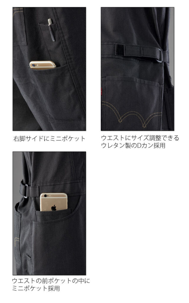 シンプルで美しいシルエットを持つタフな長袖つなぎ服。耐久性に優れているのに落ち着いた雰囲気を持つストライプ素材、クラボウ 「U CLUB」を採用したオールシーズン対応つなぎ服です。おしゃれでシンプルなシルエットの中にはスマートフォンやペン等を簡単に出し入れできる便利な2サイズの脚部ミニポケットや操作が簡単で人気のウエストサイズ調整用Dカン、コインなどを入れておくのに便利なウエストのミニポケット等、数々のうれしい機能が充実しています。