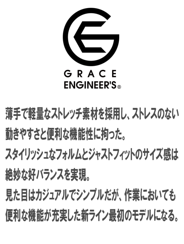 GE-340は、薄手で軽量なストレッチ素材を採用し、ストレスのない動きやすさと便利な機能性に拘った。スタイリッシュなフォルムとジャストフィットのサイズ感は絶妙な好バランスを実現。見た目はカジュアルでシンプルだが、作業においても便利な機能が充実した新ライン最初のモデルになる。