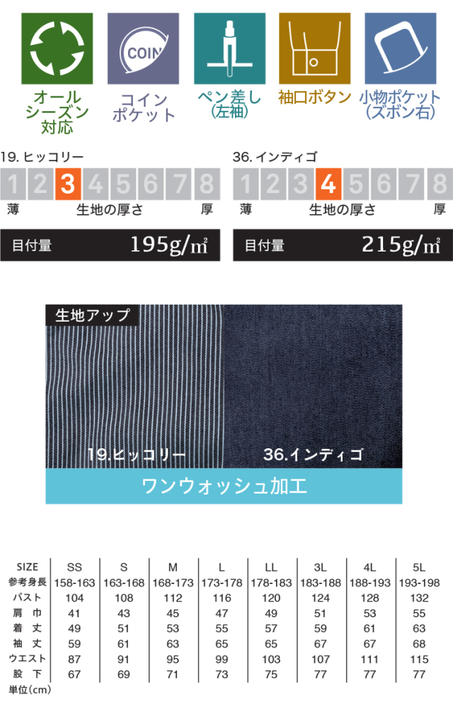 [ヒッコリー] 綿65%・ポリエステル33%・ポリウレタン2%