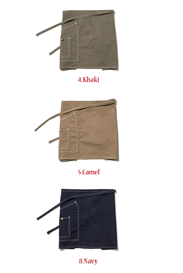 使い勝手のよいダブルポケットが特徴的短めのショート丈、使い勝手のよいダブルポケットが特徴的なショートエプロン。ストレッチ性のあるダック素材を使用し、カーキ、キャメル、ネイビーの3色展開。