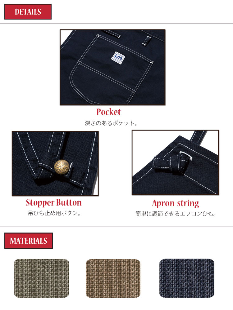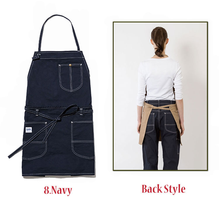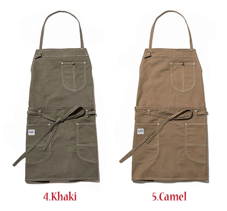 Lee独特のポケットが特徴の2WAYエプロン胸当てエプロンと腰巻きエプロンの両方使いが出来る2WAYエプロン。Lee独特なポケットの形が特徴的。ストレッチ性のあるダック素材を使用し、カーキ、キャメル、ネイビーの3色展開。