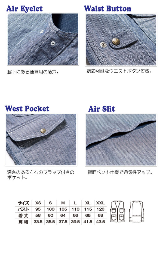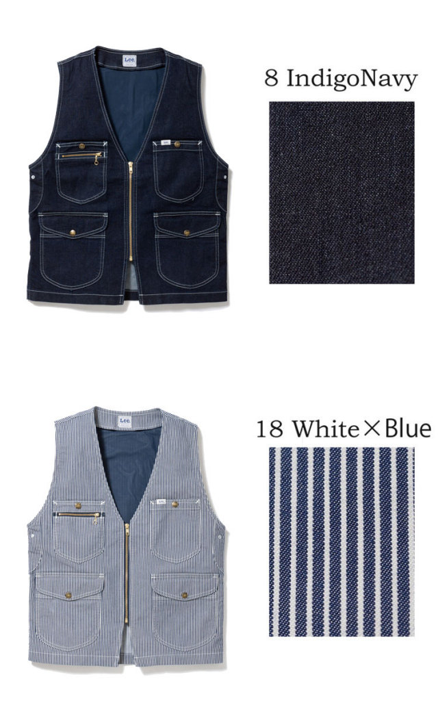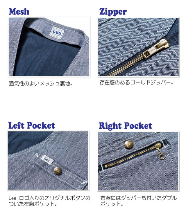 通気性にこだわったジップアップベスト。Lee独特のシェイプした形状のポケットが特徴的なジップアップベスト。収容量の多い大きなポケットや、メッシュ裏地・菊穴等で通気性にこだわり、伝統的なディテールと現代のニーズをあわせたベスト。ストレッチ性のあるデニム・ヒッコリー・ヘリンボーンの3素材展開。