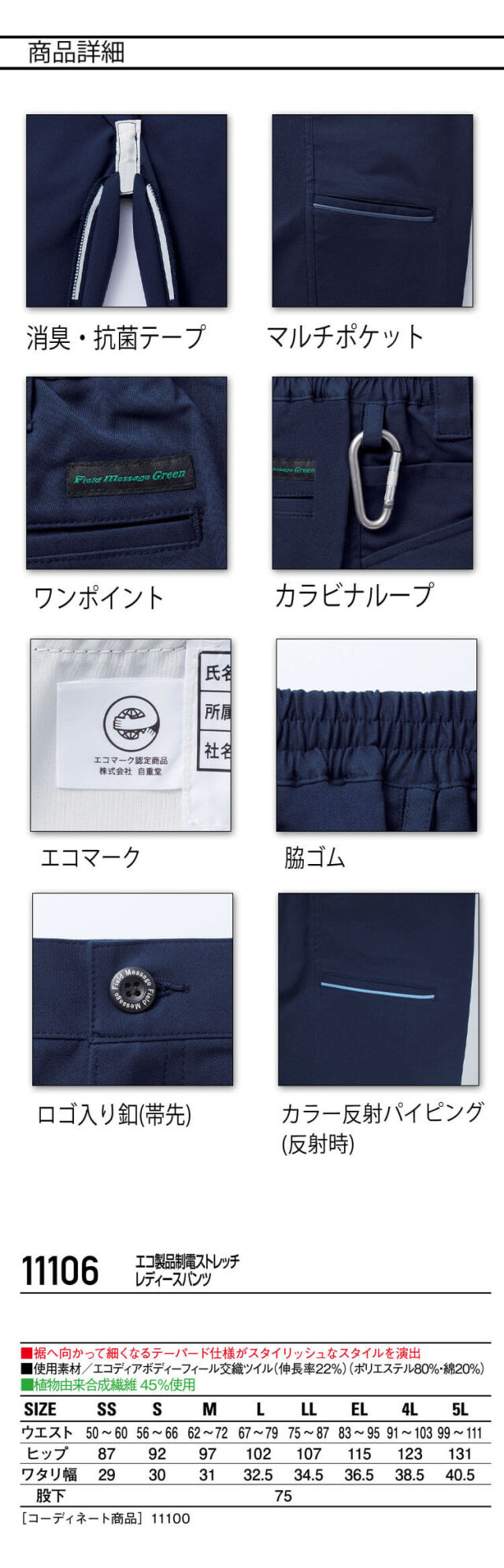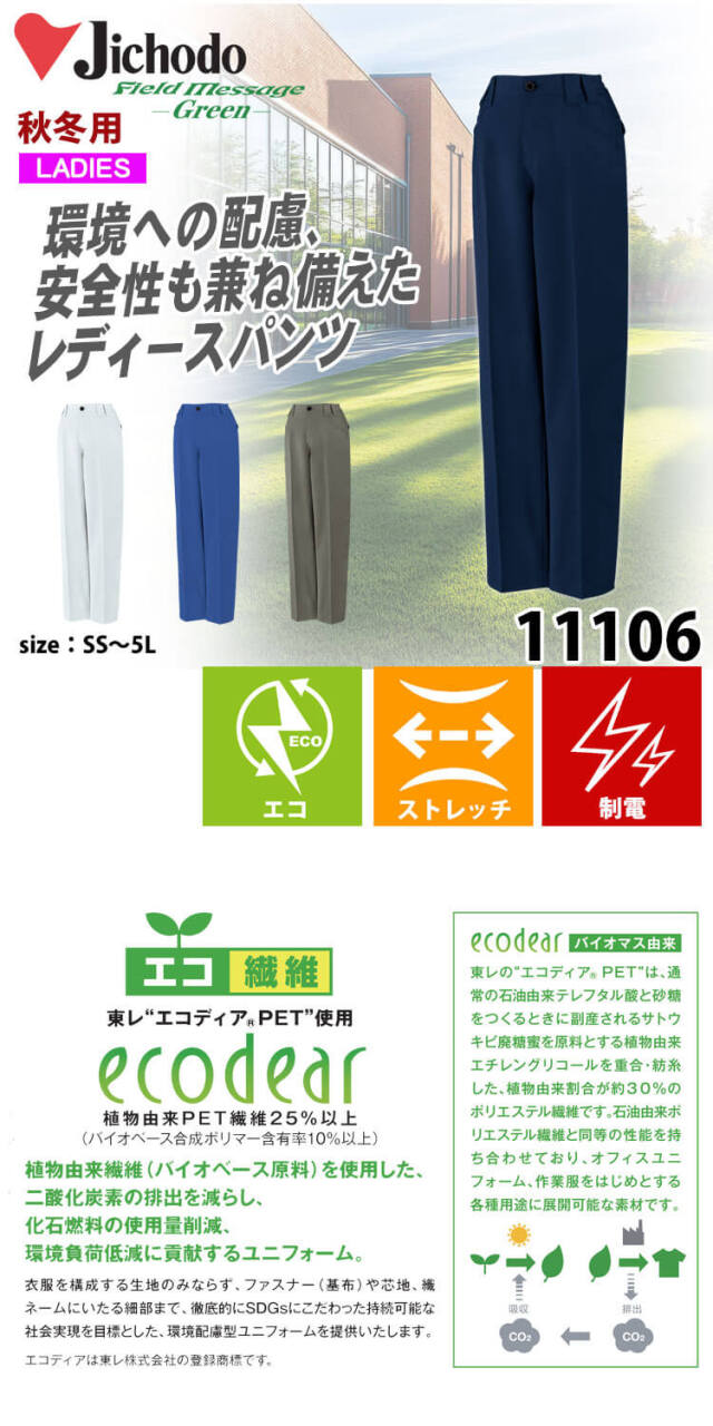 | 製品名: | Jichodo 自重堂 エコ製品制電ストレッチレディースパンツ 11106 作業着 エコ SDGs 秋冬 |
