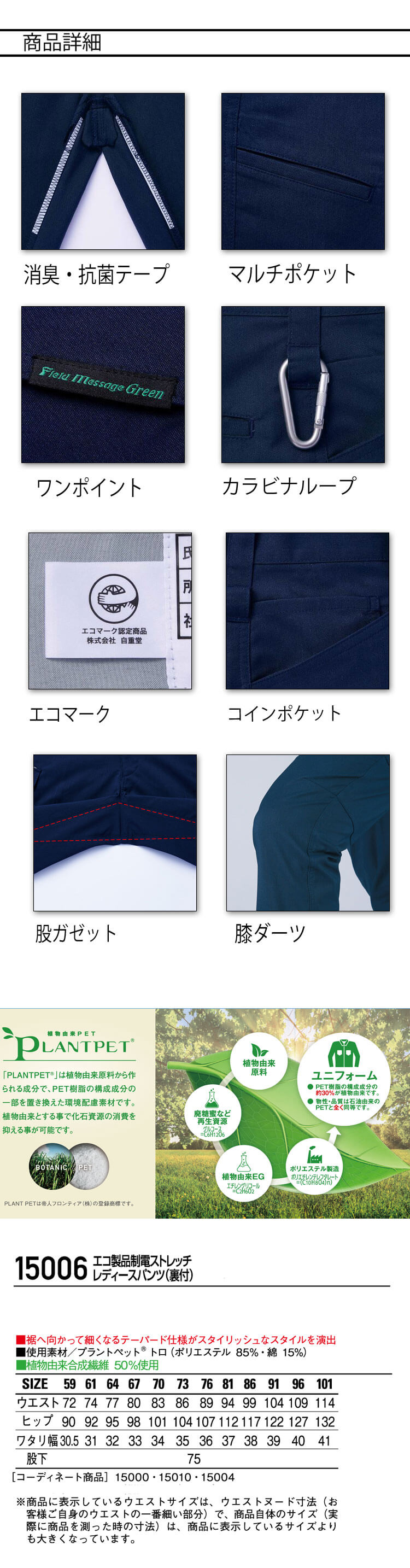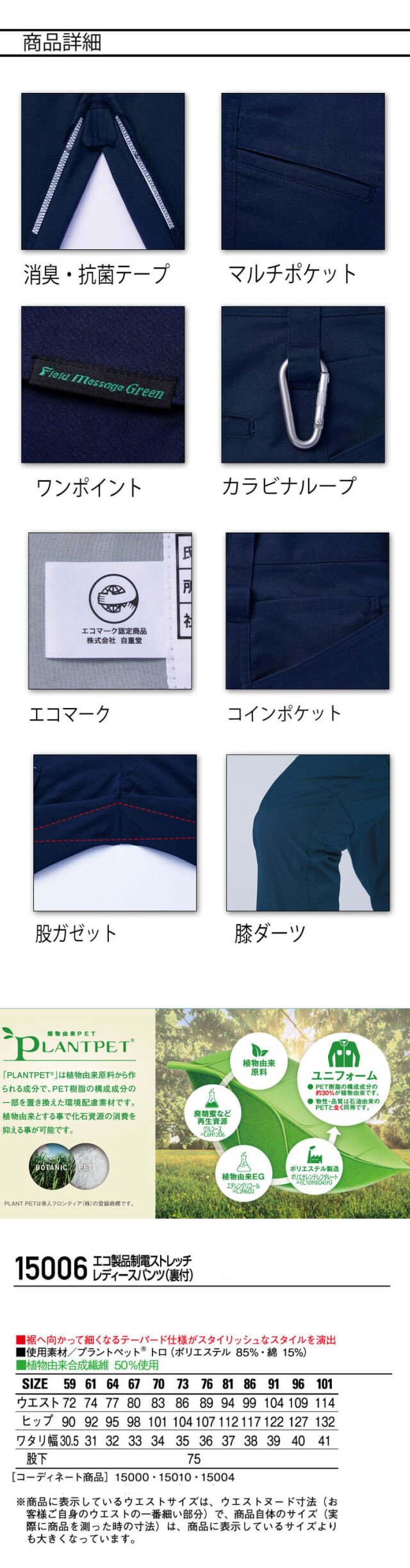 自重堂のSDGsに貢献するストレッチレディースパンツです。表素材だけでなく、付属にも環境配慮型の材料を使用した作業服です。植物由来PET繊維「PLANTPET」を使用し、SDGsの達成に貢献できるエコロジカルなワークウェアシリーズです。また、帯電防止JIS T8118適合商品、ストレッチ性のある素材で、スムーズな動きをサポートしてくれます。