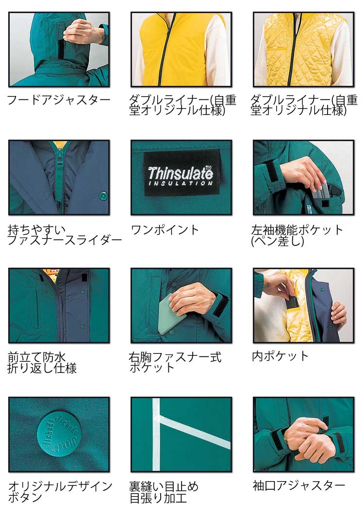 ダブルライナーで温かさと軽さを調節。防水・透湿機能搭載。高機能中綿「シンサレート」で抜群の温かさを備えつつ、「ダブルライナー」で温度調節も可能。防水・透湿機能搭載で、雪や雨の日の作業に最適。